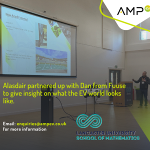 A couple weeks ago AMP EV were invited to present to the brightest minds of the next generation at Lancaster University School of Mathematical Sciences. Alasdair Croft BSc(Hon). MBA. CMgr, our MD partnered up with Daniel Lucy-Lloyd from Fuuse to give insight on what the EV world looks like, will look like and what variables come into play once you join it!